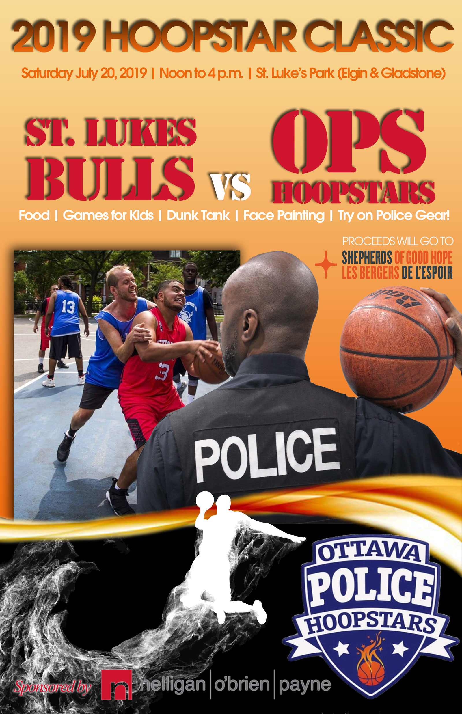 Join the OPS Hoopstars for their annual basketball day at St. Luke's Park. Free BBQ, face painting, dunk tank, jump metre and photo booth where kids can try on police and Hoopstars gear in addition to basketball games, including wheelchair basketball. Donations of canned goods, money and socks will be accepted for the Shepherds of Good Hope.